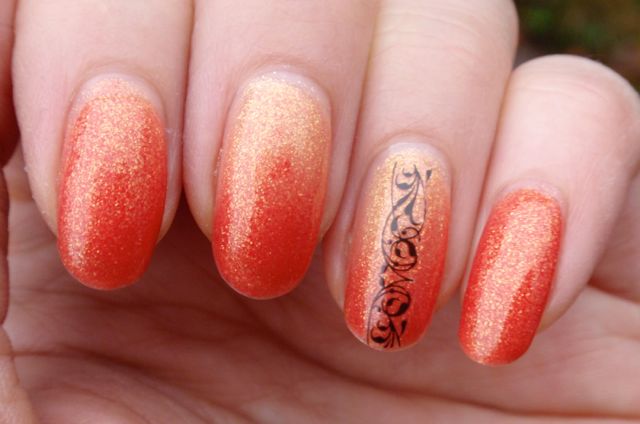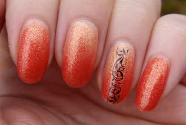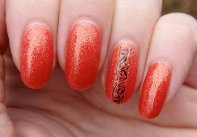 In English: In my archive clearance, I have come to a manicure with Liquid Sky Lacquer Just Lucky from 2014, that I haven’t posted mainly because I didn’t like the polish. It is a thermal that shifts between a nice reddish orange with gold shimmer when cold and a boring yellow with gold shimmer when warm. Since my hands are mostly quite warm and the tempreature shift happens at a very low temperature, it is mostly just a boring yellow. My hands had to be very cold for it to shift, and I didn’t see any shift at all at the finger tips normally. I thought it was dreadfully boring and didn’t like it at all. I have given it away now. I tried to spruce it up with some black lace, but it didn’t help…