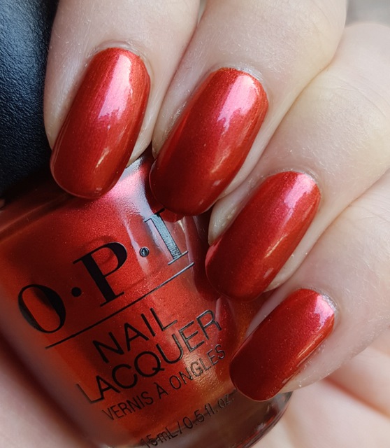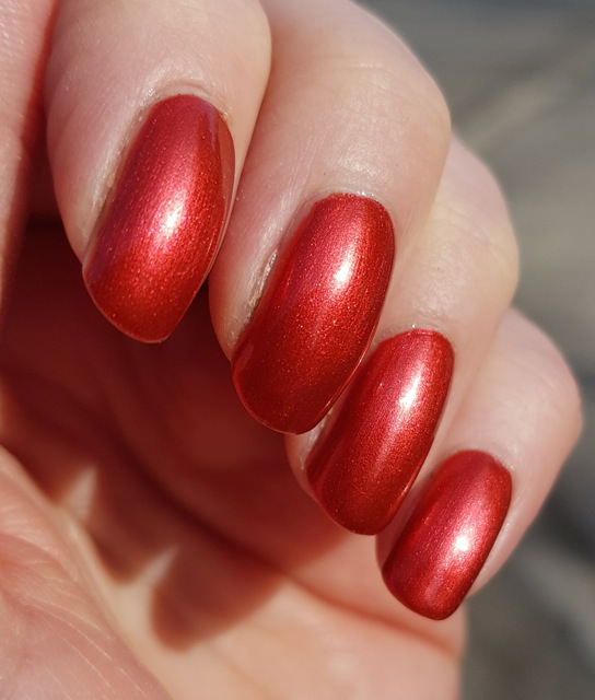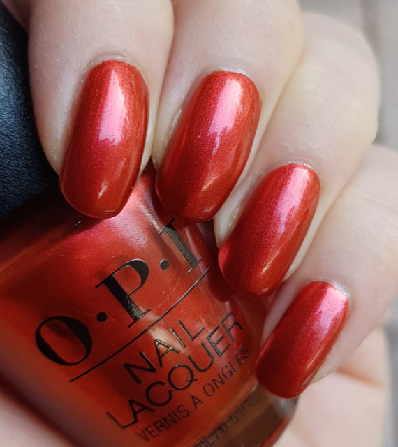 Now Museum, Now You Don’t är ett av mina favoritlack från OPIs Lisbon-kollektion. Det har ett så otroligt fint glöd! Färgen är lite svårbestämd – i solen ser det orange ut, men i skuggan blir det mer rött. Skimret är jättefint, och även om det hade en tendens att visa penseldrag när jag applicerade det så jämnade det ut sig fint. Jag bar tre lager och det var bra att lacka med.
