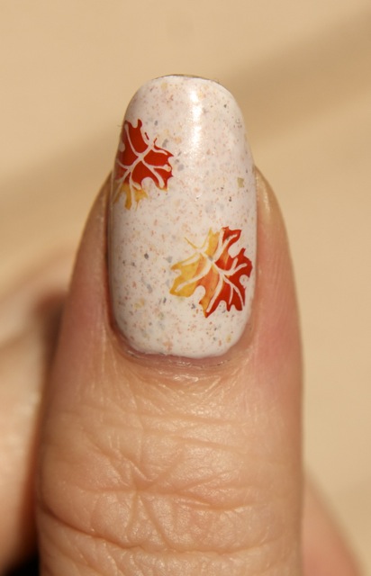 Jag har faktiskt börjat få lite kläm på det här med stämpling, så härom dagen testade jag att göra en gradientstämpling med tre lack från Depends Celebrate Personality-kollektion; röda I Like Your Style (7140), rödorangea Charm Me Up (7141) och senapsgula Believe in Me (7142). Basen är två lager av Fedoraharp Lacquer Comfy Cozy, som jag har fått från Linda. Det är ett riktigt fint lack, fräscht men lite udda. Basen är vit, och det har små glitter i grått och koppar. Två lager räckte för att få det täckande och jämnt, men det var lite svårt att applicera eftersom det var ganska tjockt och miniflaskan hade en väldigt liten pensel. Mönstret är från ÜberChic Beautys Lovely Leaves-platta, som jag tycker väldigt mycket om, och jag använde den transparenta rektangulära stämpeln från MoYou London. Jag var ganska förtjust i den här manikyren. Den var inte riktigt min vanliga stil, men ganska höstig på ett lite annorlunda vis.