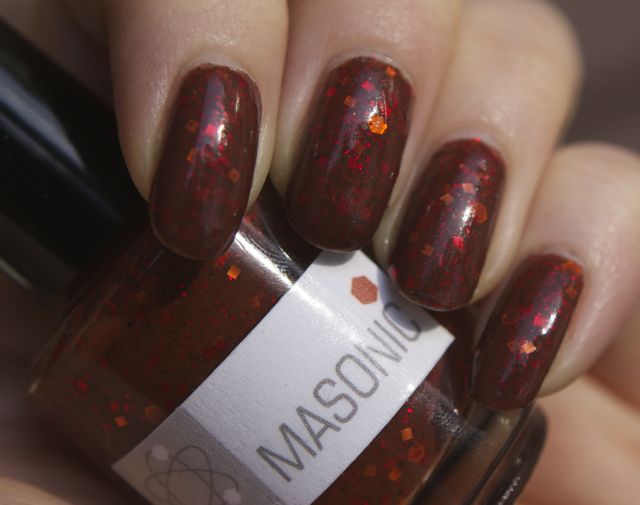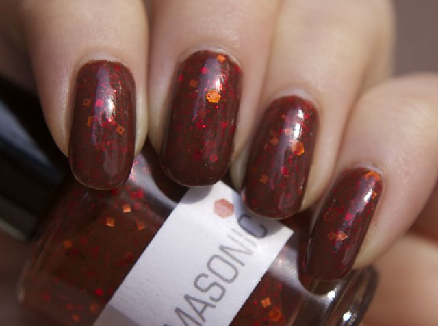 Ni vet de där gångerna man har massor av lack, men ändå inte hittar något man vill ha på naglarna? Så var det för mig när jag till slut valde Masonic. Jag var less på blingiga glitternaglar, men det kändes trist med ett krämlack. Masonic blev det perfekta mellantinget. Det är dämpat, men inte tråkigt. Udda, men inte för uppseendeväckande. Ett sånt där lack som är mycket snyggare på naglarna än man kan tro. Och det är verkligen tegelrött – delvis för att det är riktigt tegeldamm i. Basfärgen är brunröd, och det är fullt med glitter i rött, bränd orange, brons och svart mikroglitter. Det har ett otroligt fint djup.