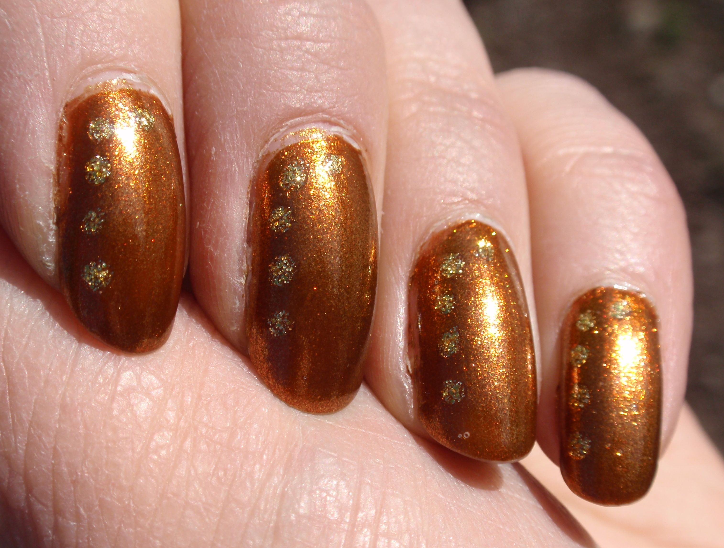 Det här lacket har fått stå på hyllan med oprovade lack oförtjänt länge. Det är riktigt fint! Varmt bronsigt och glittrar som attan i solen! Applikationen var bra, två lager täckte fint, men tyvärr tyckte jag att det inte hade så jättebra hållbarhet. Jag hade rätt mycket tipwear redan efter två dagar (det syns på den nedre bilden). Fast jag kanske bara är bortskämd från L.A. Girl Metal-lacken, som sitter hur länge som helst… Jag hade det ändå i fyra dagar eftersom det var så fint och jag inte orkade byta.
