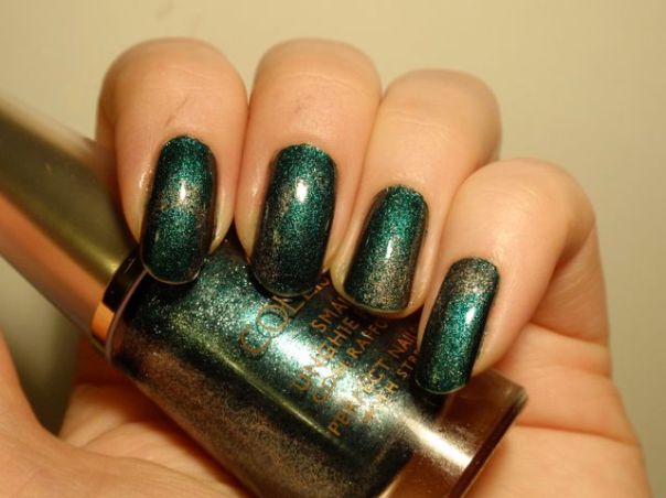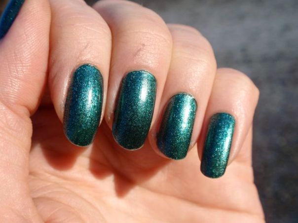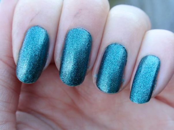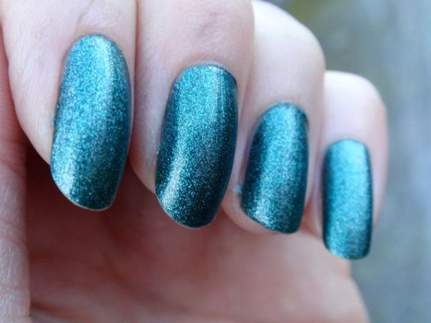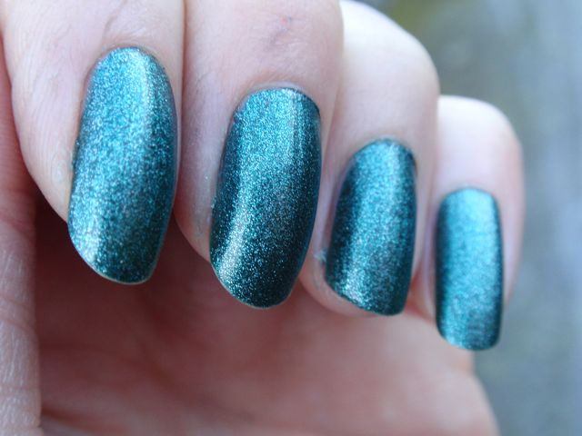 Det här är det av de tre lacken jag fick att recensera som jag var mest nyfiken på, och det är riktigt snyggt också! Det är en svårdefinierbar färg som ligger lite mittemellan blått och grönt. Enligt namnet ska det vara grönt, men jag tycker nog det är närmast blått. Det är smockfyllt med skimmer och har en vagt metallisk effekt. Det var lite bökigt att applicera eftersom det var lite tjockt och svårkontrollerbart och blev rätt kladdigt, men å andra sidan täckte det perfekt på ett lager och jämnade ut sig väldigt fint. Slutresultatet blev riktigt fint!