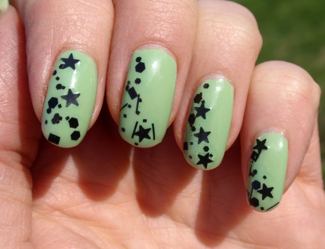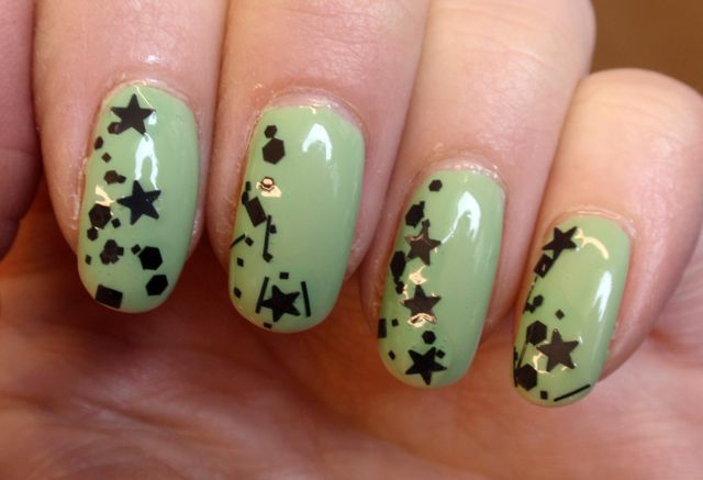 I used three coats and it was slightly runny but entirely managable. I decorated it with Emily de Molly Death Defy, which is a top coat with black matte glitters in a clear base, and some black stars.