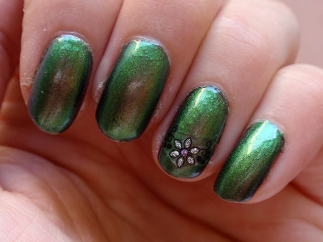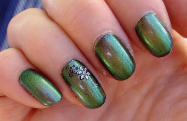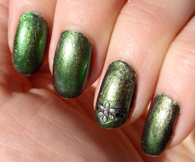 Another one of the lovely Ozotic Pro polishes! This one, Rainforest, is not the most dramatic one, but it is still beautiful. It shifts between cold grayish olive tones and warm emerald green tones. In some lights it also flashes pink. As with the other multichromatic polishes, it is too sheer to wear alone, so I wore it over one coat of the black Orly Liquid Vinyl. The formula was good, but I have problems with the drying time for these polishes. All of the multichromatic polishes I have tried dries very slowly. I don’t know if it is the polish or if it is the combination of the black creme, the Ozotic and the top coat (Seche vite). Has anyone else had the same problem?