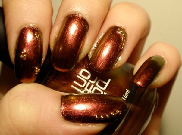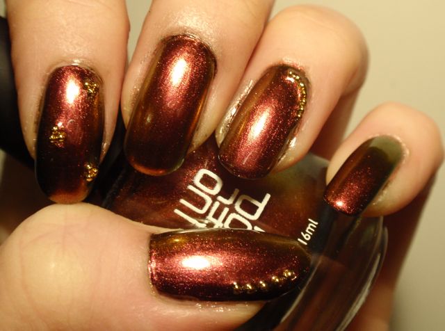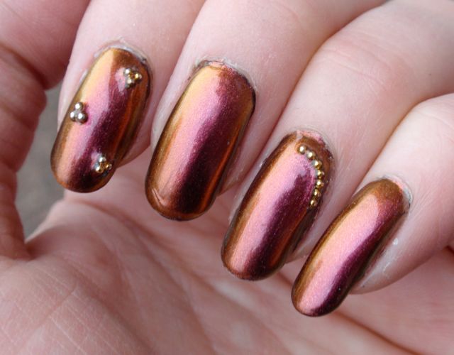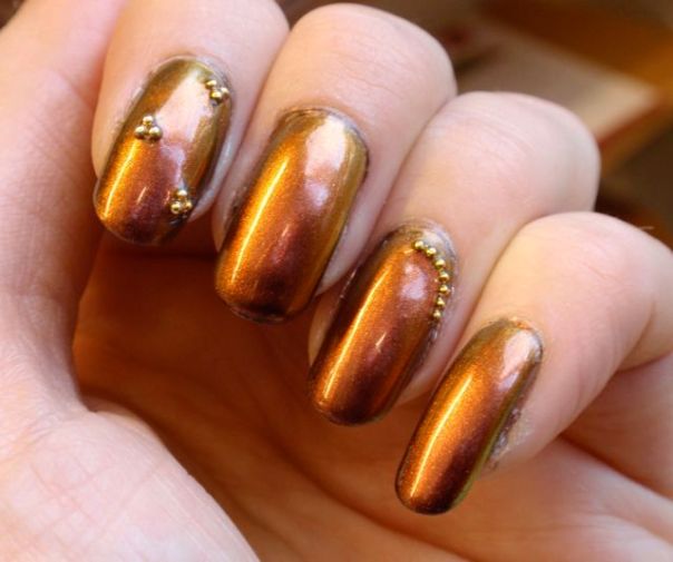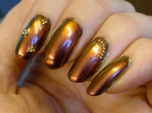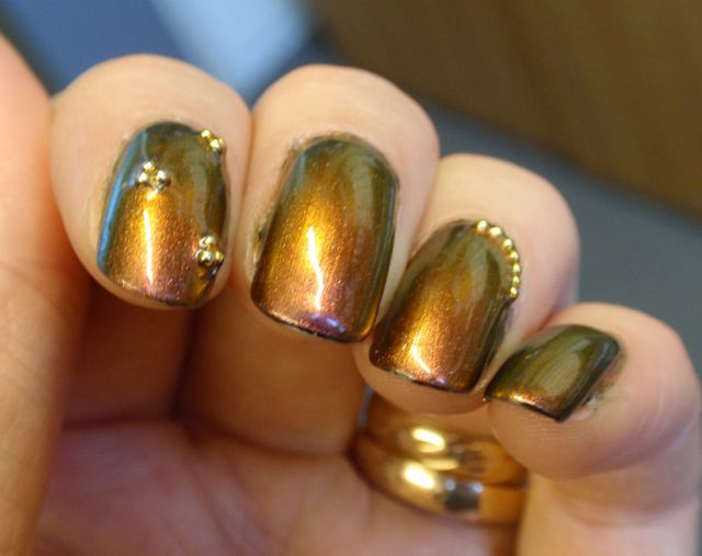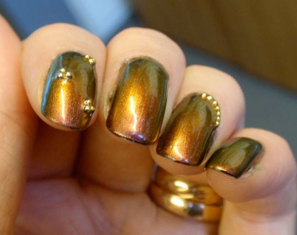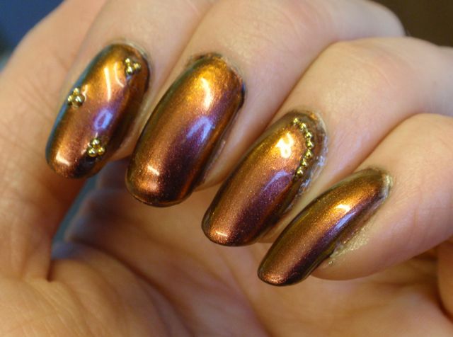 The decorations are small gold-coloured beads that I have bough on eBay. I think they worked quite nicely to add a little extra without taking all the attention from the polish.