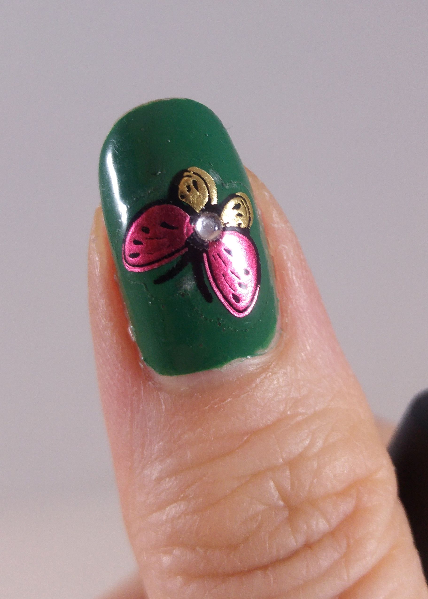 I am trying out a few different nail art top coats. Ordinary top coats tend to smear the stamping, so I am looking for the perfect top coat that doesn’t do that, but still dries quickly and has a nice shine to it. I haven’t found that yet. Gloss Sauce from Sweet & Sour Lacquer is a nice top coat, dries quickly and is shiny, but it sometimes smears the stamping, as you can see on the left pointer. On the other fingers, I instead used Apipila’s Smudge Free Nail Art Top Coat, which was really nice in the sense that it didn’t smudge at all and was very thin and easy to apply. It did dry very slowly, though, so I had to add a coat of my regular quick-dry top coat. But that combination worked really well, so it may be the best I have tried so far.