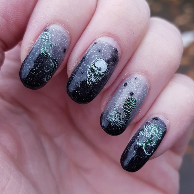 Halloween brukar vara en av mina favoritårstider vad gäller nagellack, men i år har jag inte varit så inspirerad, av någon anledning. Jag kanske bara har varit lite för trött p g a löjligt mycket jobb, men tja, så är det ibland. Den här manikyren blev i alla fall lite Halloween light. Basen är ett jätteläckert termolack från Bow Polish som skiftar mellan svart och grått i en bas som har en smula holoskimmer i sig (som jag dock inte lyckades fånga på bild p g a mulet väder och att jag jobbade alla dygnets ljusa timmar). Och som det skiftar! Det här är inte en diskret skiftning på något sätt, utan här händer det grejer! Skiftningen sker precis vid kroppstemperatur, så så fort jag hade lite småkyliga händer så fick jag en snyggt svart kant på nageln. Nu lyckades jag förstås bryta av en nagel precis när jag hade fått på det här, men jag tog några bilder med en trasig ringfingernagel bara för att skiftningarna syntes bättre när naglarna var längre. Det blev också en liten film för att visa hur snabbt färgen ändrades när jag klev ur en varm bil och stod i den kyliga, småregniga oktobermorgonen. (De svarta prickarna är alltså kalla regndroppar på lacket.)