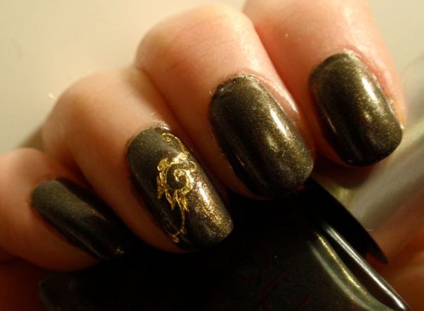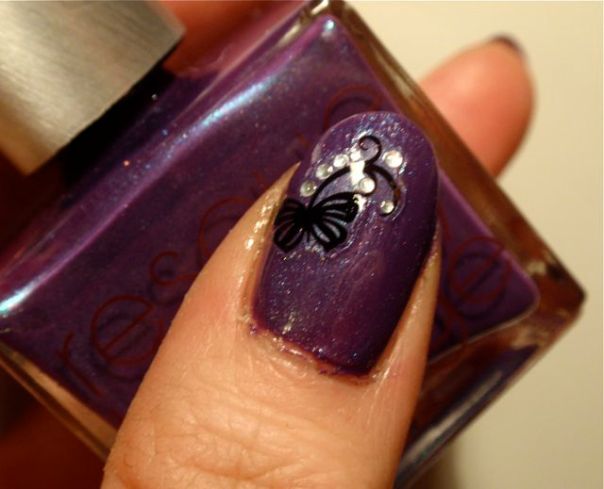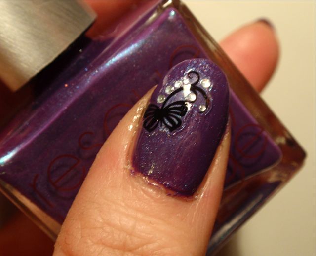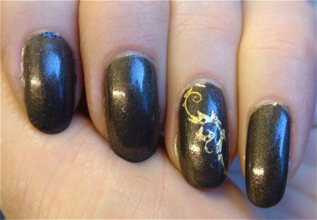Dekoren är vattendekaler som jag har köpt på eBay. De var tyvärr inget vidare alls. Det var jättesvårt att få dem att lossna från underlagspappret och de gick sönder lätt. Jag orkade bara få dit dem på tummarna och ringfingrarna. Nej, den här manikyren blev ingen favorit. Efter ett dygn bröt jag av några av mina naglar så då tog jag tillfället i akt att byta lack också..