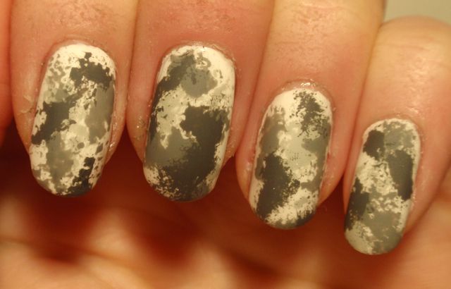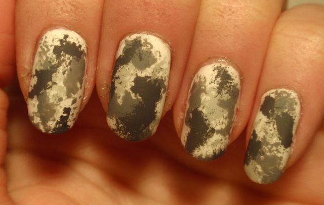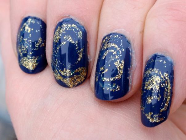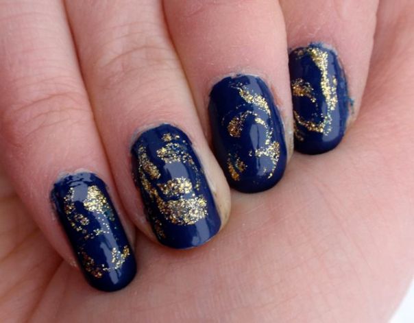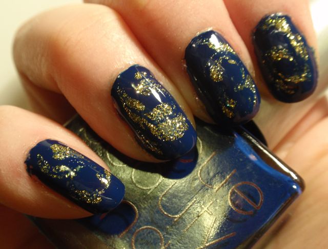 Det här är mitt första försök med marmorering, och det var faktiskt inte så svårt som jag trodde. Det blev ju inte direkt perfekt, och jag behöver öva en hel del, men det blev allt lite roligt. Jag använde Rescue Beauty Lounge Dead Calm, ett riktigt fint mörkblått lack. Det täckte väldigt bra, vilket jag misstänker är en förutsättning när man marmorerar eftersom man bara lackar ett tjockt lager som måste täcka. Sedan droppar man i ett annat lack och rör runt i det med en orangepinne eller tandpetare. Jag använde ett guldglittrigt nail art lack från Color Club att marmorera med. Instruktioner för hur man marmorerar hittade jag på My Simple Little Pleasures.