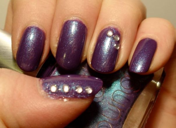 Till att börja med blev det några strasstenar på ringfingrarna och nageldekaler från Claire’s på tummarna, men dekalerna var tjocka och styva och ville inte fästa ordentligt, så efter en natt var de delvis redan trasiga och jag fick ta bort lacket på tummarna och göra om. Nu blev det istället bara en rand med strasstenar, vilket jag gillade mycket mer.