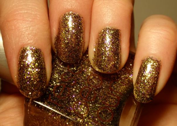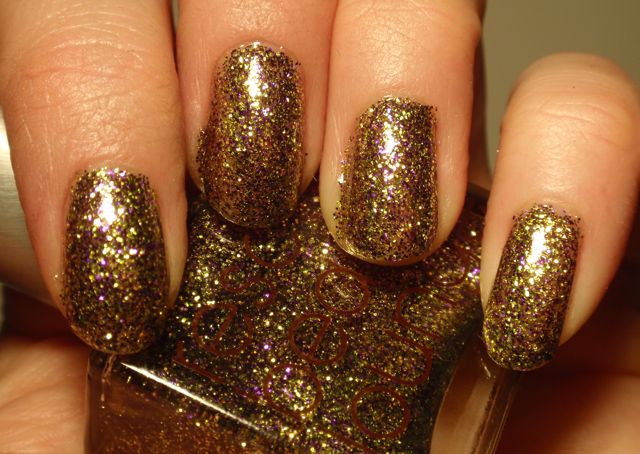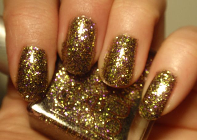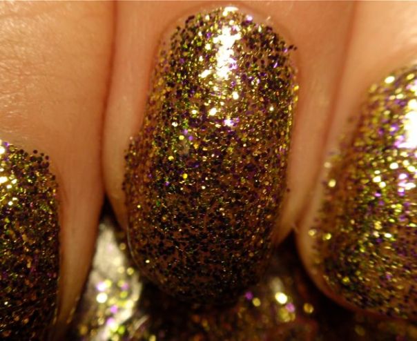 Det här är ett lack jag har suktat efter rätt länge, och nog är det läckert! Det är mestadels guldglitter, men det är lite lila glitter också som gör det intressantare. I dagsljus är det helt ok, i stearinljus eller strålkastarlljus är det riktigt läckert! Glammigt är bara förnamnet!