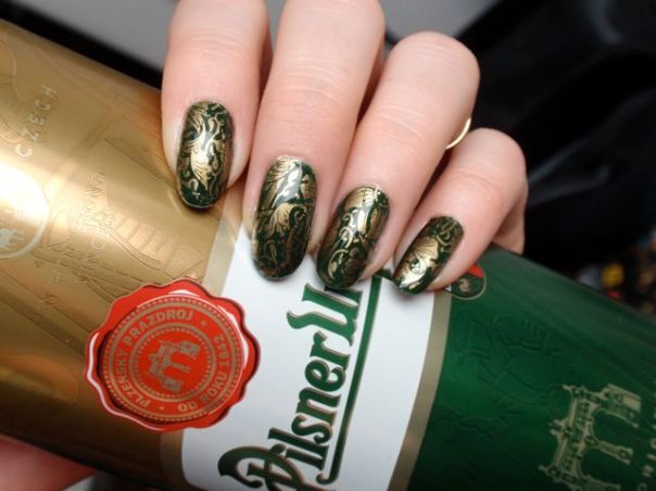 När jag satt och dekorerade det insåg jag att jag hade naglar i samma färg som Pilsner Urquells burkar, så de fick vara med på bild. Mycket passande faktiskt, eftersom det var den ölen som serverades på bröllopsfesten. 🙂