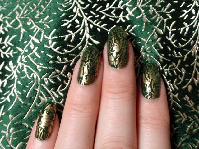 I first considered having a discreet manicure – something in gold or so, but after a while I realized that that was a silly idea. I never have discreet nails otherwise – why should I have it on my wedding day? So the nails got to be green and gold. I had a wedding dress in green silk brocade with a gold pattern, so I matched my nails to it. I used an old favourite, Rescue Beauty Lounge Recycle, as a base and topped it with a gold lace foil (bought from eBay a long time ago) that I have used a few times before and really like. I was very happy with the result and it stayed on and looked nice the whole, long wedding day!