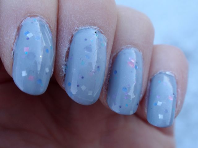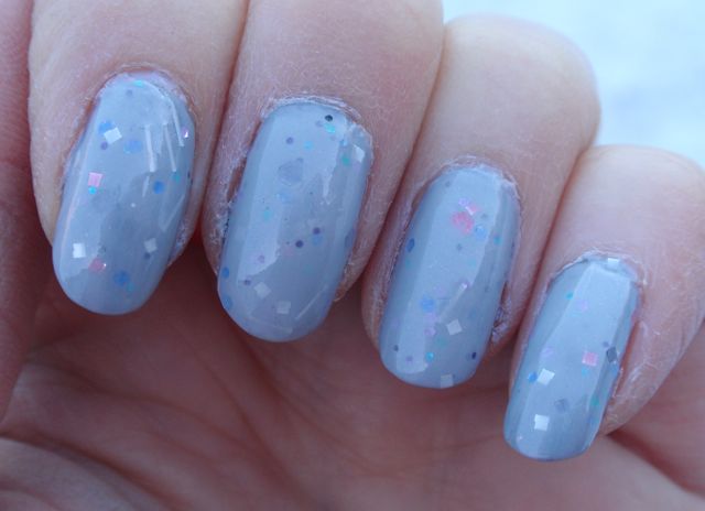 Jag tror jag blev lite förförd av namnet på det här lacket… Jag menar, hur kan man inte gilla ett lack som ger zombieassociationer? Tyvärr blev jag lite besviken på det, det är verkligen inte alls min typ av lack det här. Det är fint, men lite mjäkigt. Basen är ljust grå och det har spridda glitter i ljusa färger. Det blir lite för pastelligt och diskret för min smak. Dessutom är basen lite för täckande, så glittret blir lite dämpat av den. Jag hade det över det något mörkare gråa Rescue Beauty Lounge Stormy i förhoppningen att det skulle ge det en mörkare grundton, men Gotta Love Brains täckte faktiskt över grundfärgen i princip helt och hållet. Jag hade två lager av GLB eftersom det blev rätt ojämnt efter bara ett.