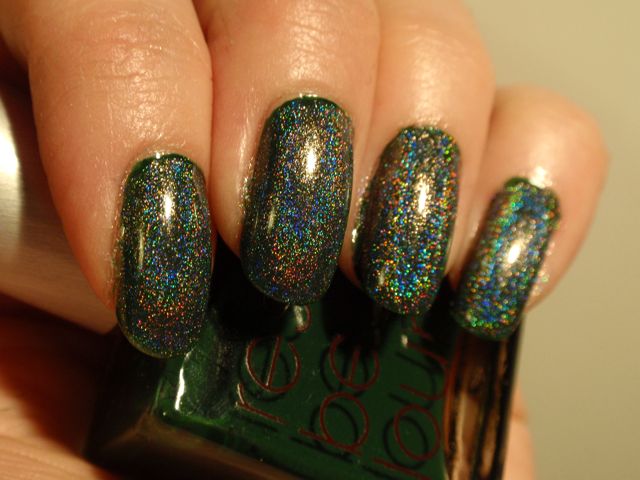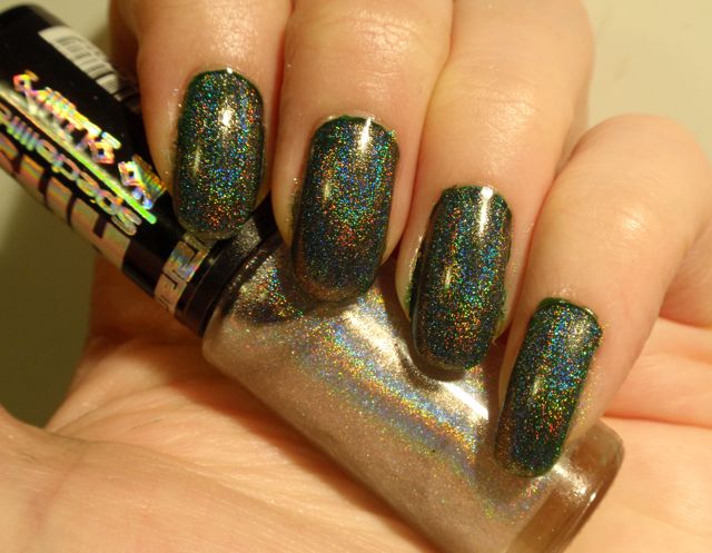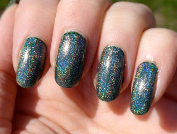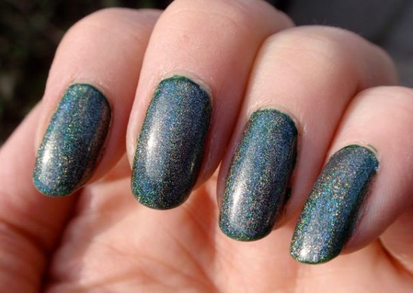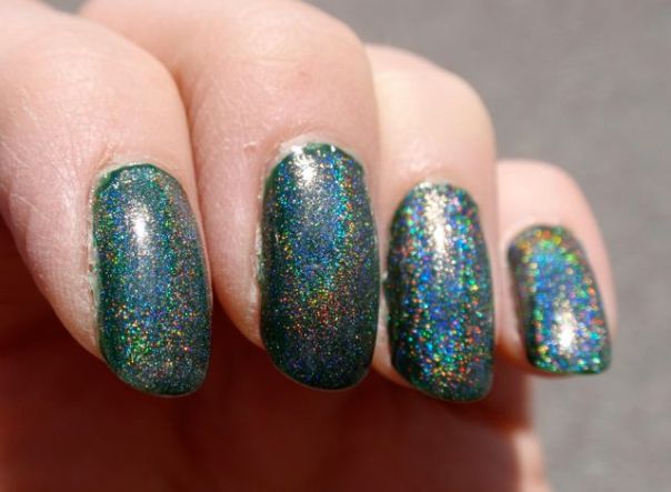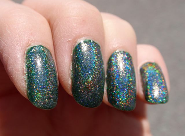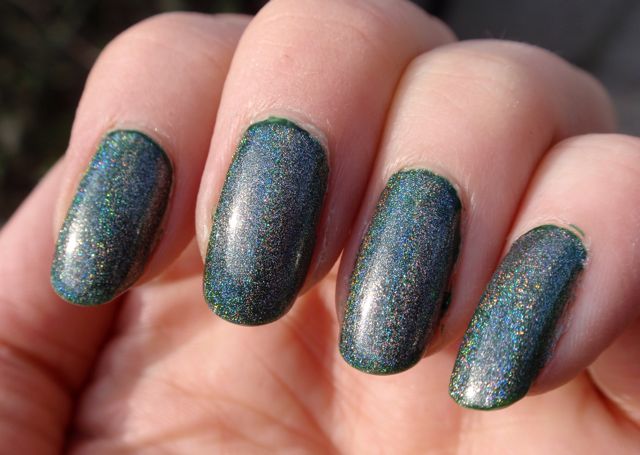 Hits Hefesto är ett holografiskt överlack, det är alltså tänkt att läggas över andra lack för att göra dem holografiska. Jag hade det över det gröna krämlacket Rescue Beauty Lounge Recycle eftersom jag länge har längtat efter ett riktigt djupgrönt hololack. Tyvärr blev det inte så bra. Holot i Hefesto skapas av spectraflairpulver (skulle jag tro) och eftersom pulvret i sig är gråaktigt tog det liksom kål på den gröna bottenfärgen och gjorde hela manikyren lite trist grådassig. Jag tror Hefesto är snyggare över ljusare lack, faktiskt. Jag funderar faktiskt på att använda det för att försöka mig på att franka fram ett grönt holo. Jag funderar på om det kanske skulle funka att blanda Recycle, Hefesto och en hygglig mängd ofärgat lack så det inte blir så att holot drunknar i basfärgen. Vad tror ni som har mer erfarenhet av att franka ihop lack? Jag har ju faktiskt inte provat tidigare.