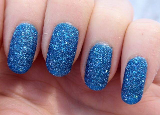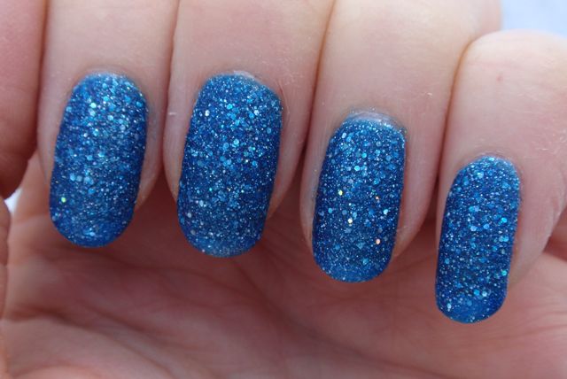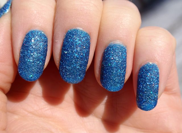Nåväl, det var ju inte det jag skulle skriva om nu, utan Get Your Number. Jag fick låna det här av min nagelgalna kompis (vi är rätt bra på att dra ner varandra i fördärvet, men ibland lyckas vi istället minska mängden köp genom att låna av varandra). Det är det jag var mest nyfiken på ur kollektionen, och visst är det fint. Jag gillar att det är en del prismatiskt glitter i det blåa, det gör att det händer lite mer i lacket. Annars är det inte riktigt min färg, det är lite för ljust blått för min smak. Jag tycker att den sandiga texturen är rätt fin, men till min förvåning blev jag rätt tossig av att ha det på naglarna. Jag hade inga problem med sammetsmanikyr och jag kan ha dekor som sticker upp på naglarna utan problem, men det här stördes jag verkligen av. Jag kunde inte låta bli att gå och pilla på det hela tiden.