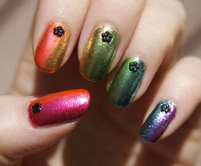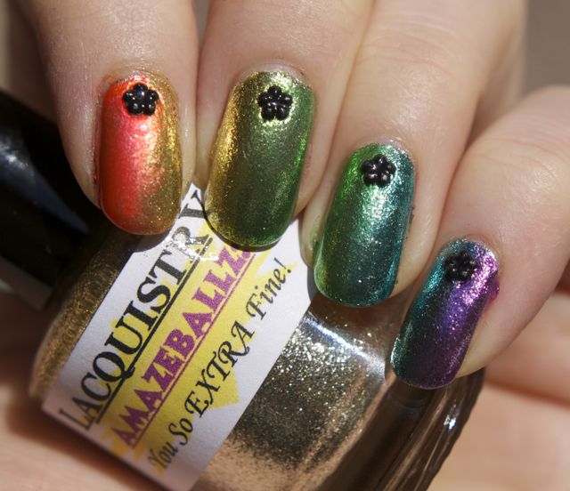 Den här manikyren är inspirerad av en manikyr av Lacquered Lover, som jag såg när jag googlade på Lacquistry Amazeballz för att se om det är en dupe till F.U.N Lacquer Pay Day. (Det är det, eller så är det Pay Day som är en dupe till Amazeballz, för jag vet inte vilken som kom först. De är väldigt lika i alla fall. Jag har gjort en jämförelse på stickor som jag ska posta snart.) Jag grundade med två lager Amazeballz. Jag har en mer finkorning variant, You So EXTRA Fine!, så den ger en väldigt jämn, metallisk yta som är lite av ett mellanting mellan guld och silver. Det täckte faktiskt nästan på ett lager och var väldigt lättlackat och trevligt. Som en bonus torkade det dessutom jättefort! På det svampade jag på ett gäng skira lack i längsgående gradienter för att skapa en regnbåge. I ordning från tumme till lillfinger blev det: Egenhändigt utspädd röd (OPI Coca Cola Red ) Maybelline Colorama Neons 191 (orange) OPI I’m Never Amberrassed (gul) NfuOh JS34 (grön) OPI I Can Teal You Like Me (blå) OPI Don’t Violet Me Down (lila) Jag blev faktiskt riktigt förtjust i den här manikyren! Det hade varit bättre med en annan orange, den här dämpade Amazeballz lite, men på det stora hela blev det rätt skojigt. Jag tycker det blev mycket bättre av de små svarta blommorna också, de band ihop manikyren. Och eftersom jag faktiskt inte hade några otestade lack som började på L, så blev det här mitt L-lack till Lacky Corners ABC Challenge. Klicka på knappen nederst i inlägget eller besök hennes blogg för fler L-lack!