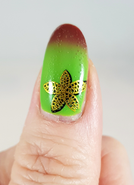 I then tried to use the same polishes for stamping, since that often works with Depend polishes, but this time it didn’t work at all. I couldn’t pick up the stamping and it was all just a big failure. Instead, I looked through my stamping polishes and found BP-108 Blue Enchantress, a thermal stamping polish from Born Pretty Store, and used that on the yellow nails. It is a medium blue when cold and shifts to a lighter teal when warm. The shift is not in-your-face, but clearly visible.