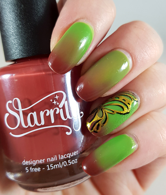 Jag har många fina oanvända lack, men det är ändå kul att återanvända gamla favoriter ibland. Zombie Blood från Starrily har jag burit förut, men det är ett så roligt lack att jag ville använda det igen. Det passar dessutom väldigt bra som halloweenmanikyr. Det är en aning smutsigt grönt när det är varmt, går över brunt i mellantemperaturer och blir bruntonat rött när det är kallt. Skiftningarna är väldigt tydliga skiftningar och det är ett riktigt läckert lack! Kanske inte direkt vackert och stilfullt, men roligt! Jag gillar också att det skiftar i så bra temperaturintervall att jag har röda fingertoppar vid vanlig rumstemperatur.