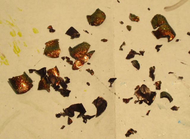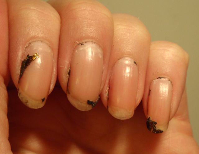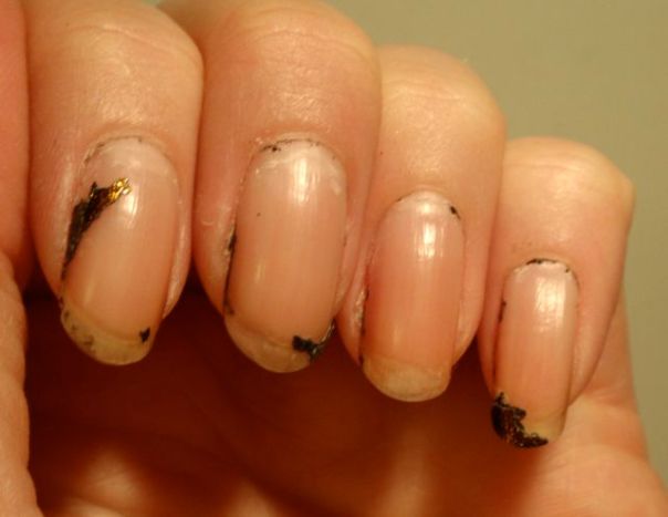 I alla fall. Jag testade som sagt att använda utspätt trälim som underlack. Det höll i två dagar för mig, men då ägnade jag mig åt en del hardcorepysslande inklusive smältlim och en del petande med naglarna, så det är inte säkert att det skulle ha hållit så mycket längre med vanligt lack. Det var helt klart lättare att ta bort än med underlack. Inte sådär att hela naglarna bara lossnade som jag sett en del skriva, utan jag fick pilla en del, men naglarna blev hyggligt rena och det gick rätt fort. Så här var bitarna jag fick loss: