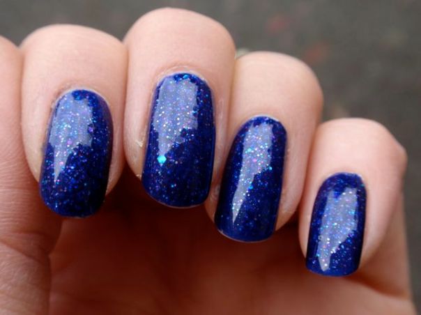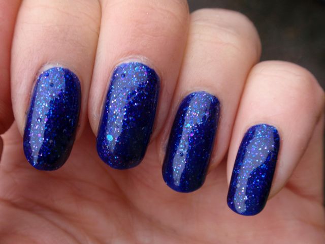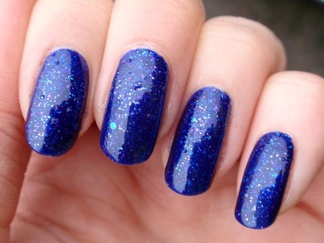 Lacket består av smått glitter i olika nyanser av blått, rosa och lila i en bläckblå bas. Det finns också några få mellanblå större hexglitter som bryter upp det lite. Det täckte finfint på två lager och var lätt att lacka med. Det var rätt skrovligt, men inte värre än att det jämnades ut av två lager Seche Vite. (Det ser lite skrovligt ut på mina bilder, men det är lite vattendroppar eftersom jag fotade det i duggregn.) Jag gillar det verkligen, det är väldigt fint. Glittret är inte för ”in-your-face”, utan det är gnistrar till lite ibland utan att bli discoboll.