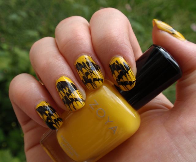 Grunden i manikyren är det gula krämlacket Zoya Darcy. Det är ett riktigt trevligt lack. Det var helt opakt efter tre lager, vilket är väldigt bra för ett gult lack. Tyvärr chippade det efter bara ett dygn, men det kan ju ha berott på mina naglar också. Jag tycker att Zoyalack brukar hålla bra. Konsistensen på lacket var lite sisådär, det var liksom lite rinnigt och tjockt på samma gång. Mönstret gjorde jag med A-England Camelot, som jag la på i ett sicksackmönster i vått lack och sedan drog en nål genom.