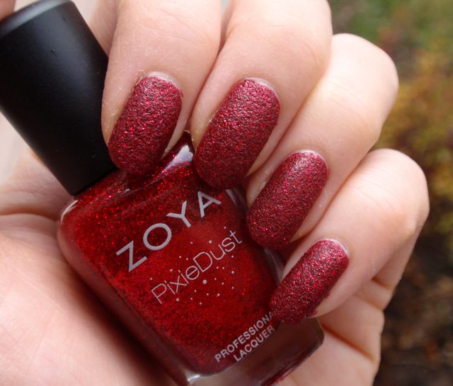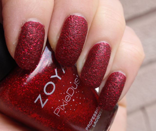 Det här är ännu ett lack som jag och min nagelgalningskompis har delad vårdnad om. (Vi gör så ibland när det är lack som vi båda vill ha, så behöver vi inte köpa var sitt.) Det är ett matt, djuprött strukturglitter som verkligen är jättefint! Det gör sig inte riktigt på bild, tyvärr, i verkligheten glittrar det väldigt tjusigt. Det var mycket trevligt att lacka med och hamnade precis var jag ville ha det. Två lager räckte för att få det opakt. Tyvärr torkade det rätt långsamt och var fortfarande lite mjukt efter ett dygn.
