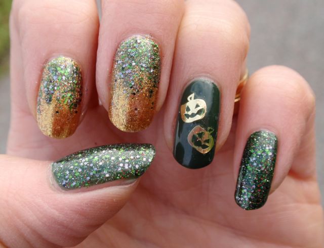The ring fingers have two coats of Zoya Hunter a lovely green creme with an excellent formula. I added some gold pumpkin embellishments from She Sells Seashells while the polish was still tacky. If you try them, be careful to bend them around an orangestick or pen before using them, as they stick out quite a lot otherwise.