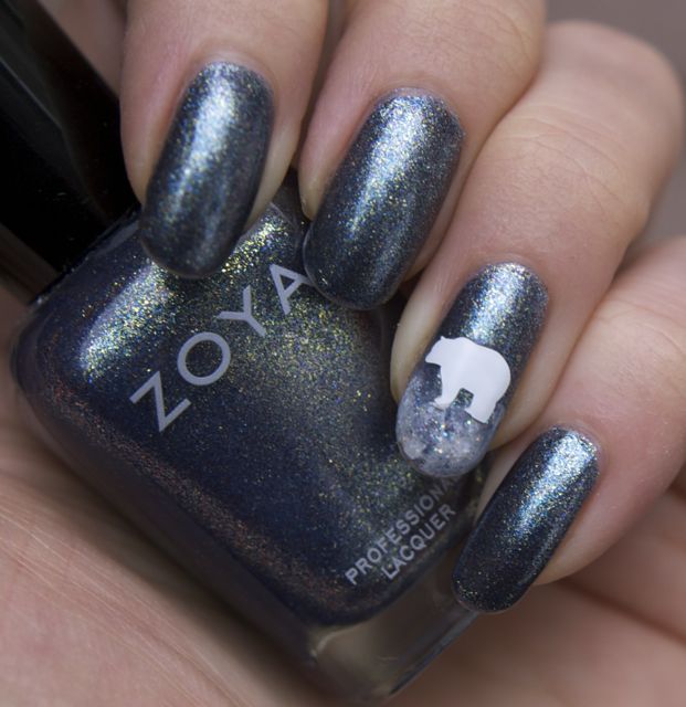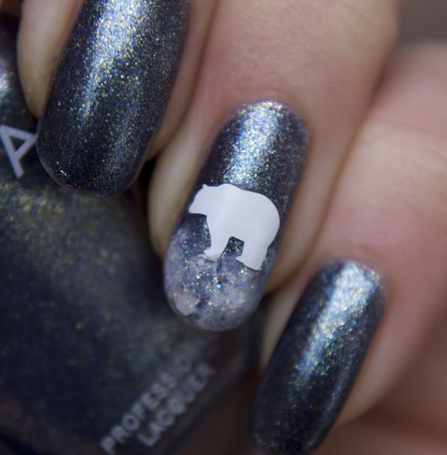 After a day I made an accent nail with a polar bear sticker from She Sells Seashells on snow spunged on using Models Own Snow White, Lynnderella Love, Lace and Lilacs and Color Club Si Vous Please!.
