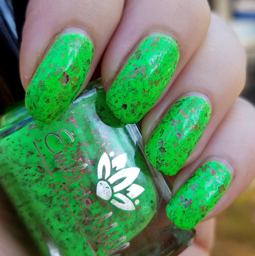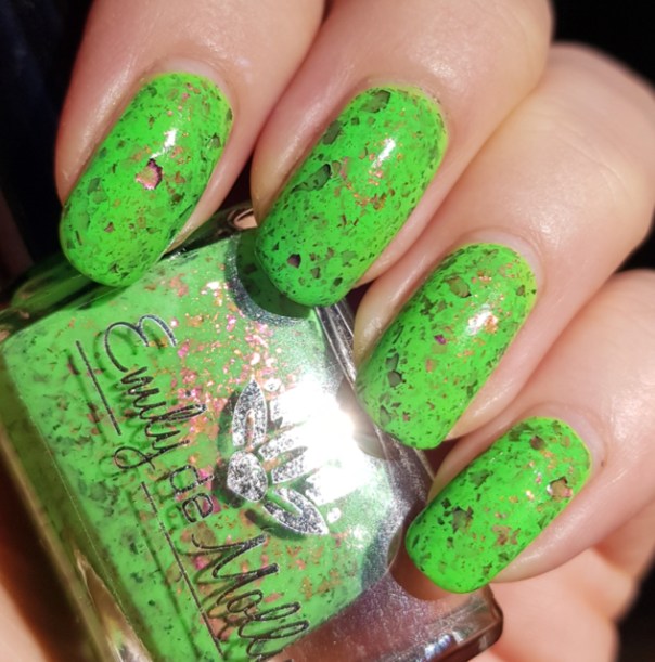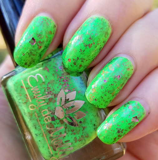 På sistone har jag varit sugen på färgglada lack, och vad kan då passa bättre än neongrönt? Margarita Verde från Emily de Molly är gjort exklusivt för Hypnotic Polish och är ett härligt neongrönt lack med flakes som skiftar i orange, guld och rosa. Förutom att man blir glad av att se det så blir man också glad av att applicera det eftersom det täckte på två lager och gled på som smör. Full pott på det här, alltså!