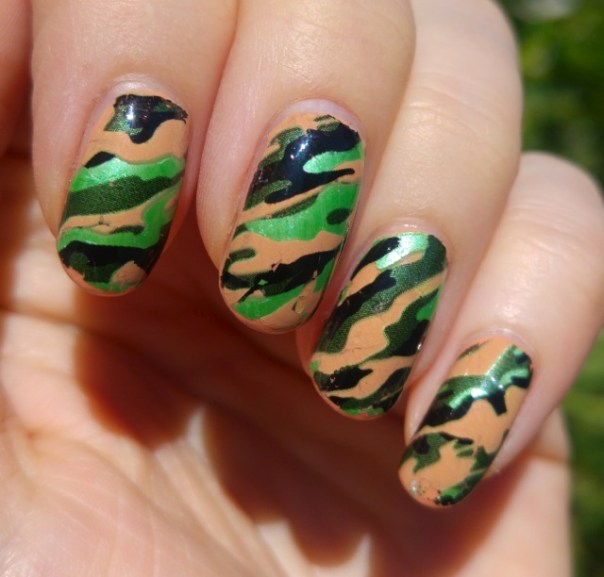 In English: A couple of weeks ago, I realized that it was a very long time since I did a foil manicure, so I did one. I have bought the camo foil from the final sale at Edgy Polish. For a base colour, I used Wisdom Iris from the Depend The Language of Flowers collection (it was sent to me as a press sample). It is a light apricot creme that is very nice and summery, and I actually liked it more than I thought I would. It was pretty sheer, though, and I needed three coats to get it opaque. The application was good, though, so I didn’t mind much.