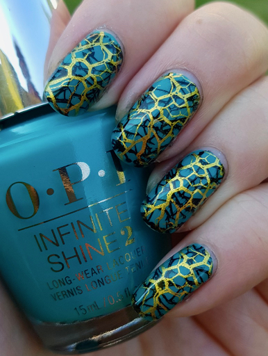 Jag ville piffa till det lite och stämplade med guldstämplingslack från Born Pretty Store och plattan 5-02 från ÜberChic Beauty, vilket dock knappt syntes IRL. Jag hade nog behövt ett mörkare guldlack för att det skulle synas mer.