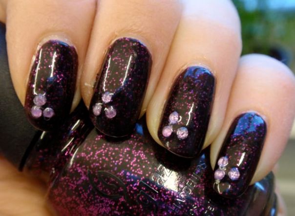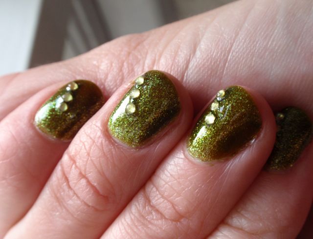 Dekoren är målad på fri hand med nail art penna och sedan tryckte jag dit några strasstenar. Tyvärr blev det superbubbligt, jag vet inte riktigt vad som hände. Kanske var mitt Seche Vite för tjockt.