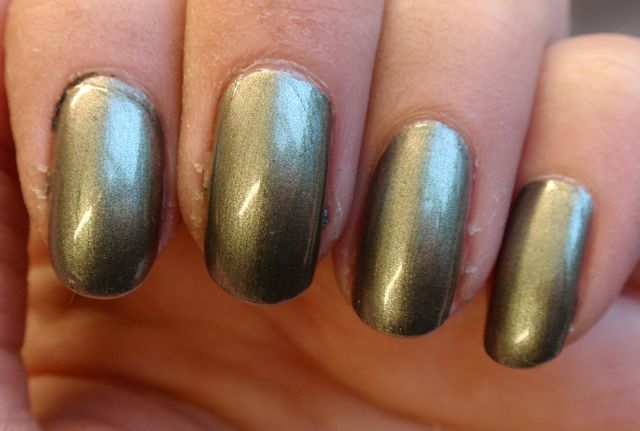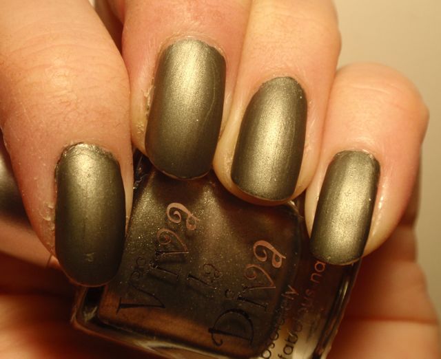 Ehm… det var visst rätt länge sedan jag bloggade (igen)… Det har varit lite fullt upp ett tag, men nu ska det bli lite bättre hoppas jag, så det nog bli lite bloggat framöver igen. Jag har massor av bilder i arkivet i alla fall, så det finns att skriva om! Men jag börjar med det jag har på tassarna för närvarande, Viva la Diva 132. Inte så spännande, men det är en fin färg. Väldigt kall grön-grå ton. Jag har inte varit så sugen på att dekorera, så det fick vara som det är. Jag målade med det igår och la nyss på ett lager matt överlack (China Glaze Matte Magic), som faktiskt gjorde det mycket trevligare. Det blev väldigt sammetsmjukt i färgen. Vilsamt för ögonen.