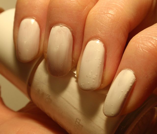 Jag testade också ett nytt vitt krämlack under Sun-Kissed. Vitt krämlack är ju något man måste ha hemma, men jag har inte varit riktigt nöjd med China Glaze Snow, som jag har använt tidigare. Det kräver tre lager för att täcka och tar lång tid att torka. Nu testade jag Models Own Snow White, och lite preliminärt så tycker jag nog att det är ett trevligare lack. Det täckte riktigt bra, på bilden har jag bara ett lager. Det var ganska lättlackat också. Enda problemet var att det bubblade lite, som ni ser på ringfingret och lillfingret. Bubblorna syntes inte igenom det gula lacket däremot, så jag har lite hopp om att det kan vara ett bra alternativ framöver.