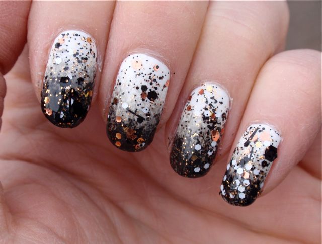 Häromdagen insåg jag att jag helt hade glömt bort att jag har fått ett lack från China Glaze’s halloweenkollektion Monsters Ball att recensera. Det borde jag ju egentligen ha visat runt Halloween, men det fick bli nu istället. Det är ett glitterlack med olikfärgade glitter i svart, vitt och brons i en klar bas. Jag lade det över en gradient i vitt, grått och svart. Som bas testade jag för första gången det vita lacket NP-13 från Nordic Cap, som mitt lokala Hemköp har börjat sälja. Jag har hört mycket gott om det, och jag är verkligen imponerad. Det täckte faktiskt på två lager, vilket inget annat vitt lack jag har gör, och blev slätt och fint. Lite tjockt är det, men det är ju lätt åtgärdat med lite förtunning. Och det för 10 kr – verkligen ett prisvärt lack! Det gråa lacket i gradienten är Rescue Beauty Lounge Stormy och det svarta är A-England Camelot. Det blev kanske lite rörigt, men jag tycker det var helt ok ändå. Jag gillade hur det var skenbart monokromt men gnistrade till i brons emellanåt.