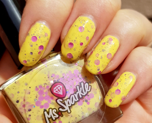 Ms Sparkle Meadowsweet är ljusgult med runda rosa glitter, mindre glitter i svart och lite hologlitter. Det var förvånansvärt bra att applicera. Det täckte på tre lager, hamnade där jag ville ha det, vallade sig inte och täckte riktigt bra för att vara gult. Jag behövde inte ens fiska efter glittren! Jag gillar det verkligen och det känns väldigt påskigt!