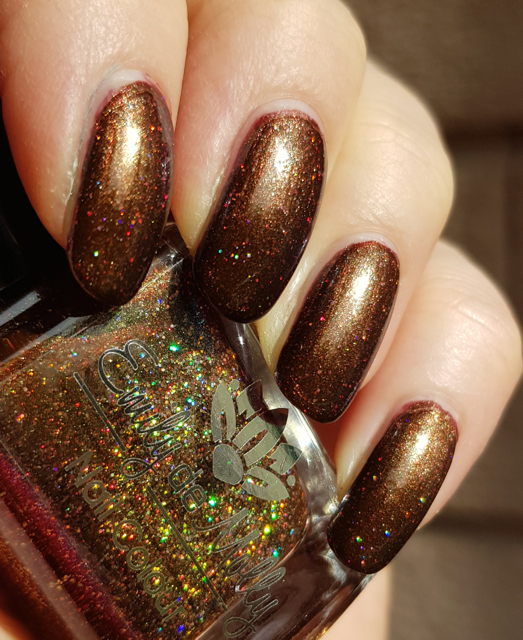 Nu är ju äntligen solen tillbaka, och med den kommer mitt sug efter holo. Rise Above the Flames från Emily de Molly har fått stå till sig i några månader, men nu har det fått komma fram. Det är egentligen duokromt, men den effekten är diskret och svår att fånga. Basfärgen är mörkt kopparröd (så pass att den ser brun ut i vissa ljus), och den skiftar i mörklila i vissa vinklar. Det har också guldskimmer och holografiskt guldmikroglitter. Jag tror det finns en del rött skimmer i den också.