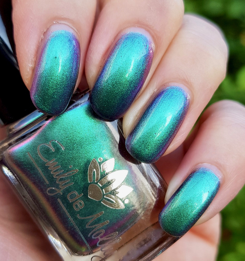 In English: Emily de Molly is one of my favourite indie brands, and here is another beauty from them. Near And Far is a gorgeous multichrome that primarily shifts between green and purple, but also flashes blue and pink in some lights. And these are no discreet shifts!