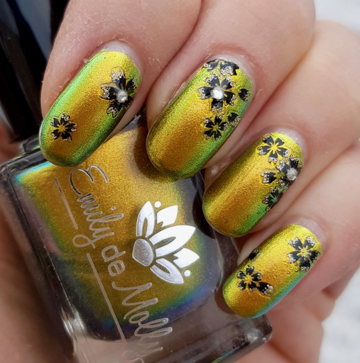 Hide the Sun from Emily de Molly is a green glitter with holographic microglitter and flakies shifting in orange, gold and green. Gorgeous! I wore two coats and it was easy to apply, especially considering how much glitter it is in it.