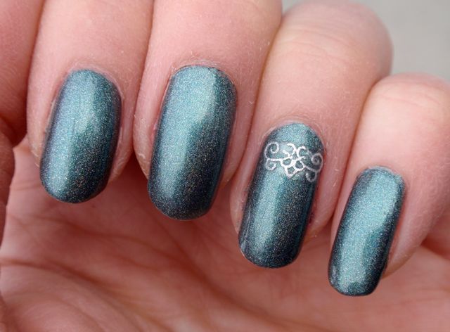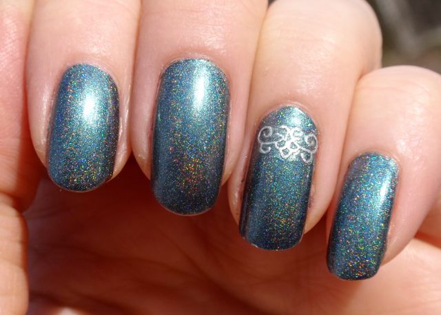 Till den här veckans holofredag har jag faktiskt ett egenhändigt ihopblandat hololack att visa er! Jag fick tag på riktigt Spectraflair via Spectraflair4u på Storenvy. Jag kommer inte längre ihåg vad jag blandade det med, men det var lite grönt och lite blått pigment och resultatet blev ett grönblågrått hololack som jag är riktigt förtjust i. Färgen är rätt svårbestämd, och holoeffekten åt det lite mer diskreta hållet, men det är fint! Från början hade jag tänkt göra ett grönt holo, men gråheten i Spectraflair tillät inte det. Jag tycker det blev fint ändå, så jag är nöjd i alla fall. Det täckte på två lager. Tyvärr gjorde jag bara en miniflaska av det och kommer väl aldrig kunna återskapa det, men tja… Det räcker väl till två manikyrer till i alla fall och hur troligt är det att jag har det mer än så?