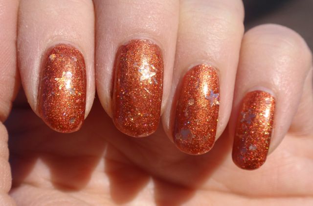 The polishes for last week’s ABC Challenge wasn’t very exciting, but I am happy to say that this week will be better. For K I’m showing one of the polishes I mixed for Karin as a present for her PhD thesis presentation. It is inspired by her red hair and energy and is a coppery shimmer with red and prismatic microglitter, a prismatic silver glitter mix and some extra holo glitter stars. The glitter was difficult to capture with my camera, so you’ll get a short film as well. I am really quite happy with this!