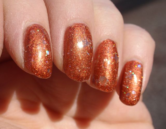 It is fairly sheer (I didn’t want the glitter to drown in the base), so I wore two coats over two coats of Orly Chocolate Martini. Last time I wore the Orly polish I had some problems with the application, but not this time.