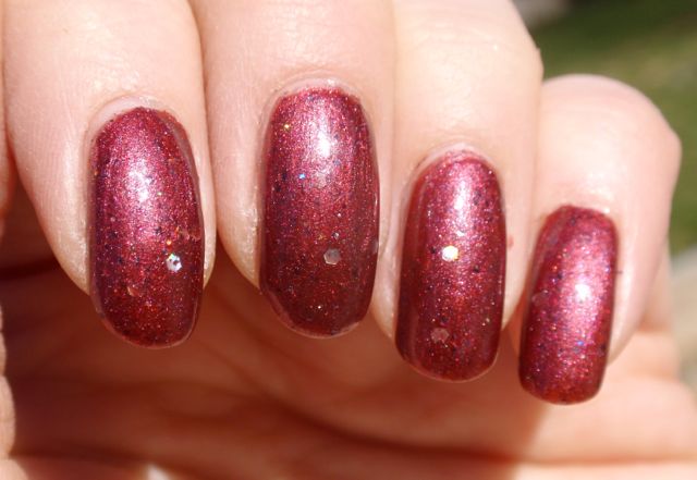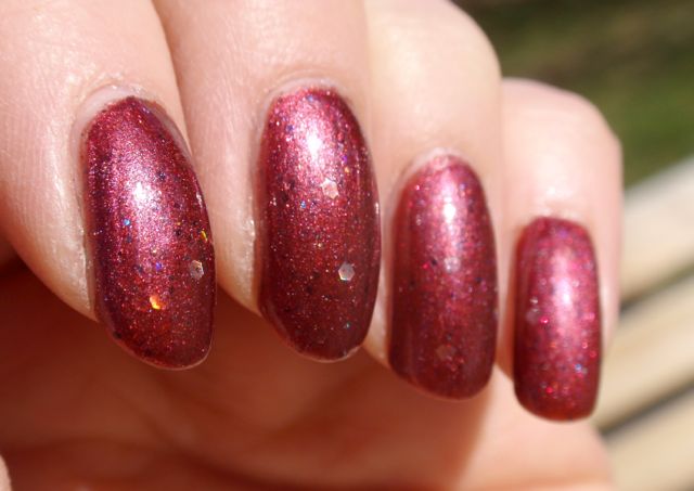 This is the fourth and last of the polishes I made for Karin as a dissertation present. (The others are Your Future is Bright!, Shb KO and Karin.) It is inspired by the box classes that she and I took sometimes when whe still was in the country. We had quite a lot of fun beating on each other. 🙂 I wanted it to be blood red, but the pigment disagreed and it turned out wine red. (It is a little darker than it looks in the pictures.) I don’t remember what I used any more, but I know that there is a good amount of red shimmer in it to try to get it redder. There is also some holo glitters and small black glitters. I wore three coats. It isn’t super unique, but I kinda like it.