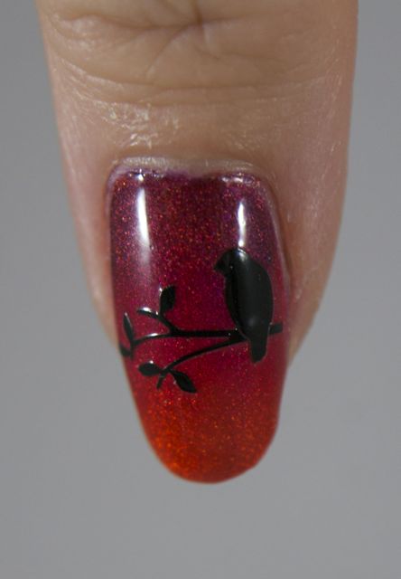 I am actually extremely happy with this manicure! The polishes went very well together and the holo gave the gradient an amazing glow without drowning it in rainbows. The thought was to make it look like a sunset, so I also added some bird and branch decals from Youpolish. I really liked the decals, they were very soft and pliable – and pretty!