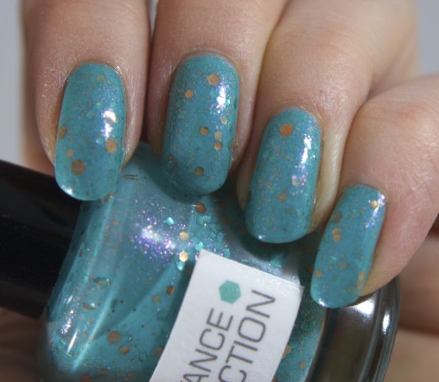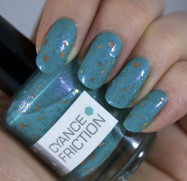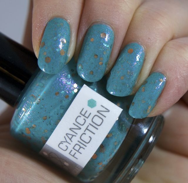 Cyance Friction kommer från Nerdlacquers Nerd Crush-kollektion och är starkt blåturkos med kopparfärgade och turkosa glitter och rosa skimmer. Knalligt, in-your-face och ganska så underbart! Jag gillar det verkligen, men jag måste vara på rätt humör för att bära det. Jag hade två lager på de flesta fingrar – på några blev det tre för att få upp lite mer glitter. Som med de flesta Nerdar var det lätt att applicera. (Och bara som lite kuriosa kan jag nämna att jag nu äger 45 Nerdlacquers. Jag har lyckats få tag i de flesta jag vill ha!)