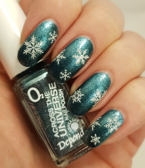 Under min Edinburghresa i förrförra veckan lyckades jag faktiskt bära samma lack under hela resan, d v s i hela fem dagar! Jag var ganska imponerad av hållbarheten, faktiskt, och det var skönt eftersom jag inte hade mycket tid till sånt som att måla naglarna. Det fantastiska lacket i fråga är North of Andromeda, från Depends Across the Universe-kollektion. Det är från O2-serien och har nummer 5058. Jag har fått det som pressprov. Det är en mycket snygg blått metalliclack med ett stänkt grönt i. Två lager täckte och applikationen var bra. Som dekoration petade jag på lite snöflingedekaler som jag har köpt från Nailshop.se.