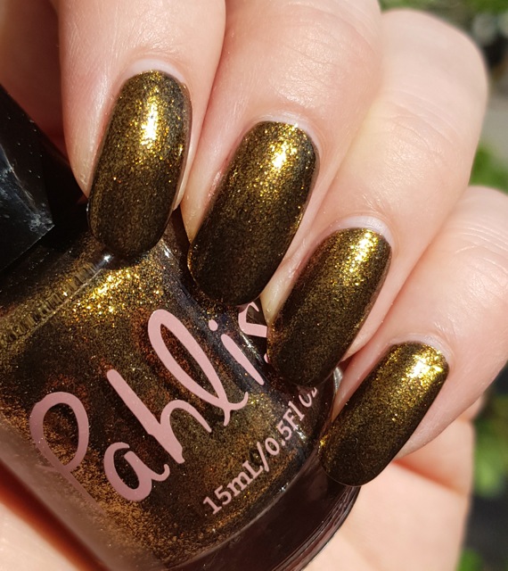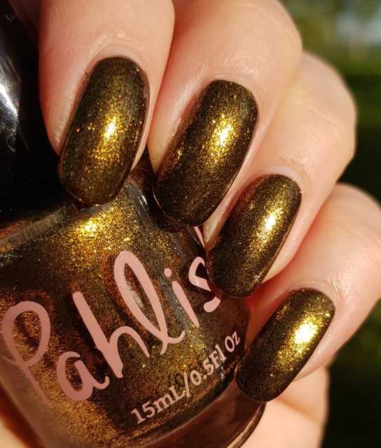Pahlish Hellebore är ett sånt där lack som jag kanske egentligen inte borde köpa fler av, men ändå inte kan motstå (och älskar, fast jag har flera liknande lack redan). Det är ett svartnat guldflakie, som är sådär härligt antikguldigt i finishen och dessutom väldigt metalliskt och glittringt.