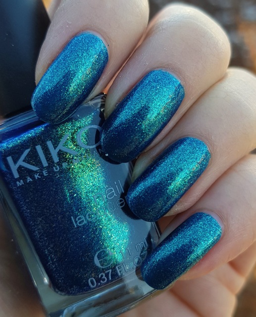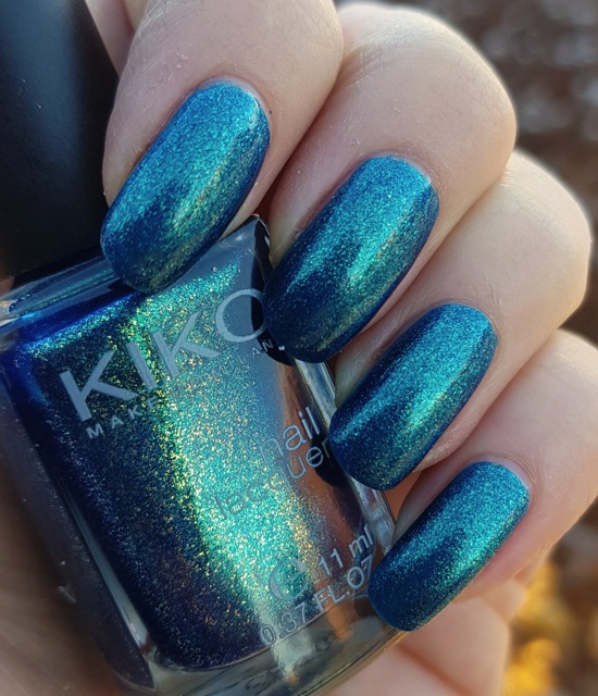 Kiko kan vara mitt favoritmärke i budgetklassen. Det är otroligt så bra deras lack är, särskilt med tanke på priset. Jag tror jag köpte det här för några år sedan när jag var i Rom, och det kostade väl runt en euro. För det priset får man ett vackert folielack som är blått i basen med grönt skimmer, vilket ger en duokrom effekt. Det har också guldskimmer i sig som grädde på moset. Väldigt tjusigt!