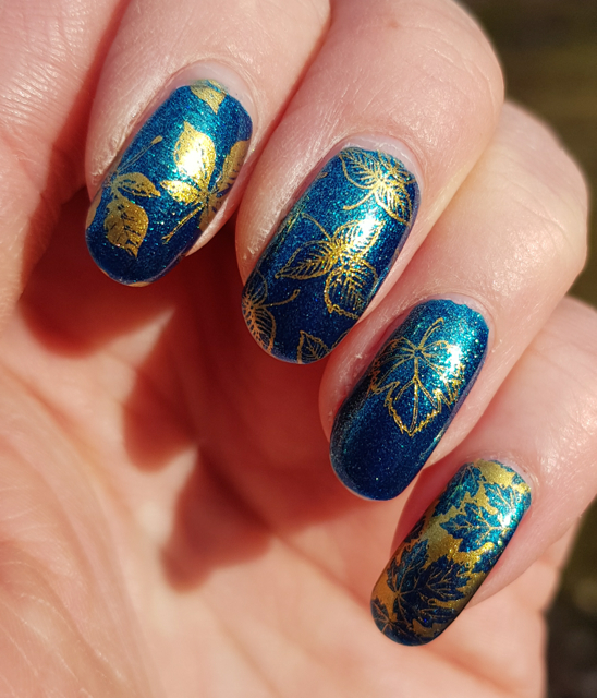 Jag stämplade med ett guldstämplingslack från Born Pretty Store och plattan Autumn 03 från Lina Nail Art Supplies. Det blev väl riktigt bra! 🙂